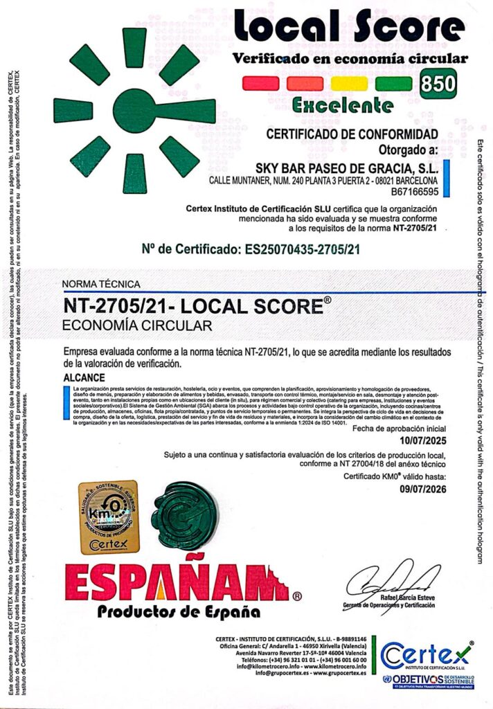 - Impulsamos la economía circular del territorio conforme a LocalScore (NT 2705/21): prevención y valorización de residuos, envase sostenible y retornable cuando sea viable, logística de menor impacto y eco-diseño de carta y eventos.