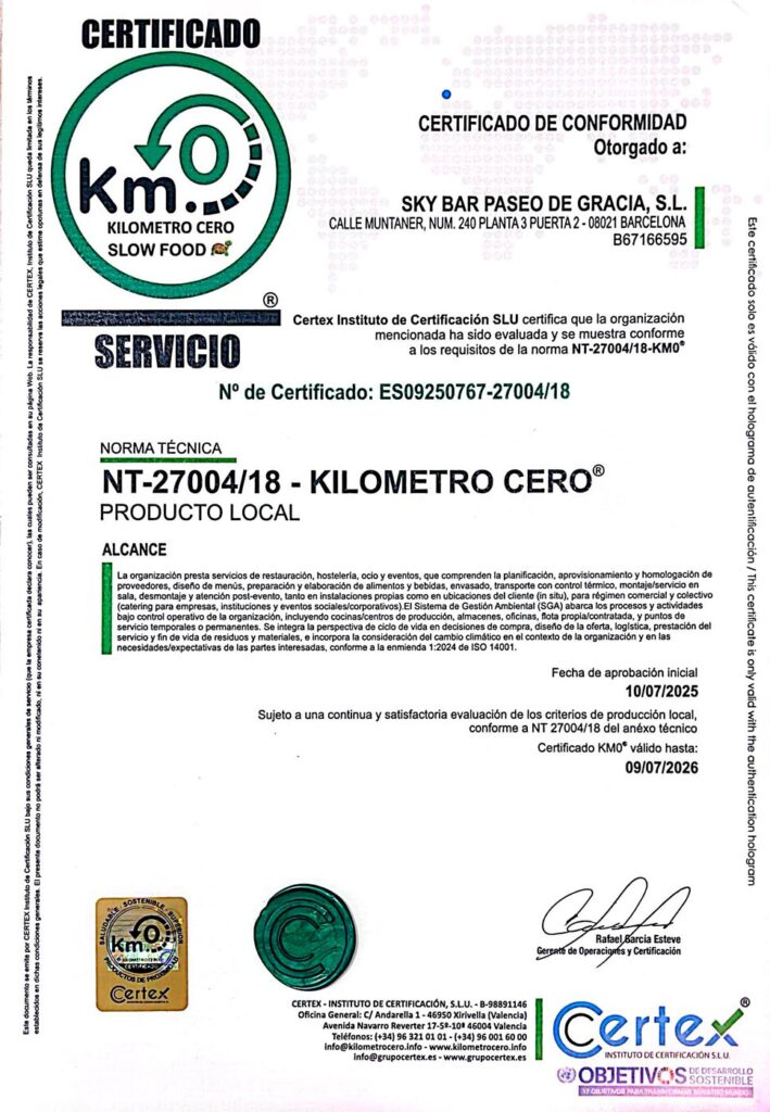 - Priorizamos producto local y de temporada conforme a Km0 (NT 27004/18) y declaramos que contamos con un Registro de Proveedores Homologados Km0, sujeto a evaluación y seguimiento periódico de criterios de proximidad, trazabilidad y buenas prácticas ambientales.